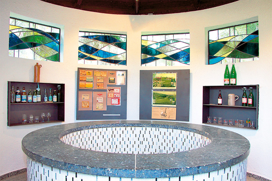 Das Brunnenhaus wurde in ein echtes Kleinod umgestaltet, indem eine Glastüre eingebaut, durch die neben der mit Mosaik verkleideten Brunnenstube auch die schönen Fenster sichtbar werden. Von außen sind sie kaum zu erkennen. Von innen kommt durch einfallendes Licht die farbige Ornamentik zur Geltung. An den Wänden sind Regalnischen angebracht, in denen historische Stücke wie alte Flaschen und Etiketten ausgestellt werden, dazu alte Fotos und Werbetafeln.